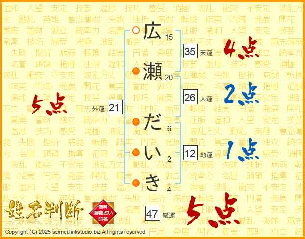広(15画)瀬(20画) だ(6画)い(2画)き(4画)