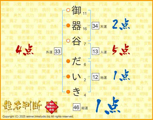 御(11画)器(16画)谷(7画) だ(6画)い(2画)き(4画)