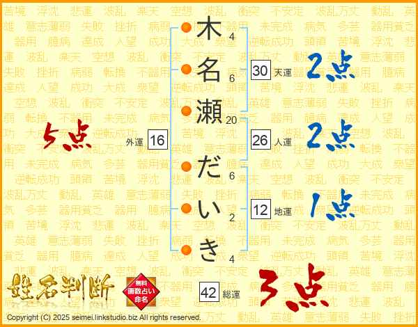 あなたの人生を表す1番重要な運勢です。生涯を通じて影響する総合運となり、主に50歳以降の晩年期に影響を及ぼします。苗字と名前の合計画数。