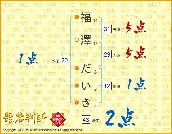 福(14画)澤(17画) だ(6画)い(2画)き(4画)