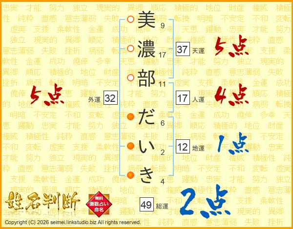 美(9画)濃(17画)部(11画) だ(6画)い(2画)き(4画)