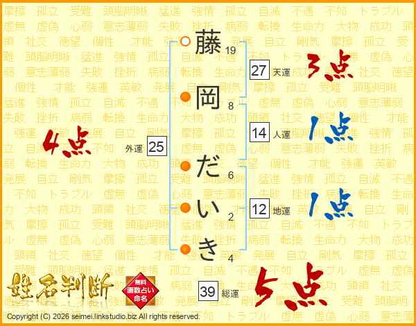 藤岡だいきさんの総運は39画の5点!