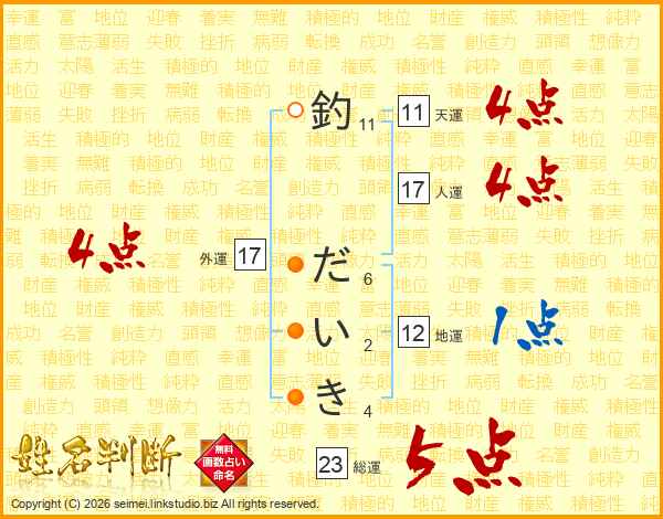 釣だいきさんの人運は17画の4点!