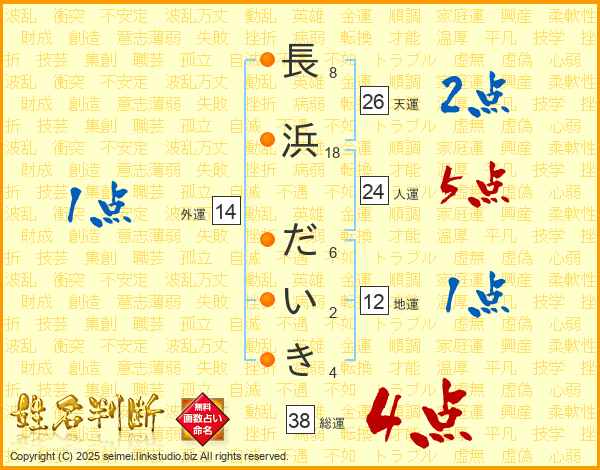 長(8画)浜(18画) だ(6画)い(2画)き(4画)