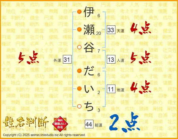 伊瀬谷だいちさんの総運は44画の2点!