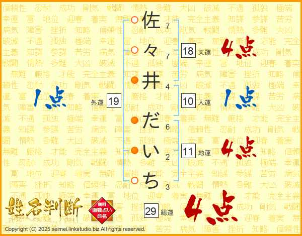 佐々井だいちさんの総運は29画の4点!