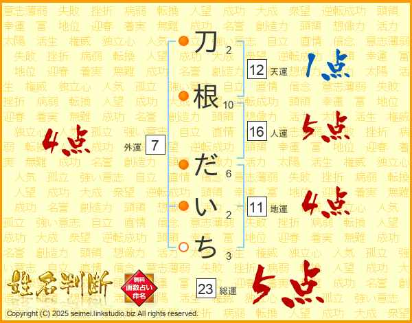 刀(2画)根(10画) だ(6画)い(2画)ち(3画)