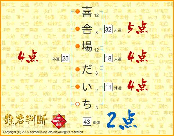 喜(12画)舎(8画)場(12画) だ(6画)い(2画)ち(3画)