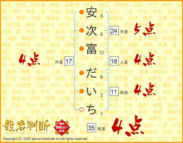 安(6画)次(6画)富(12画) だ(6画)い(2画)ち(3画)