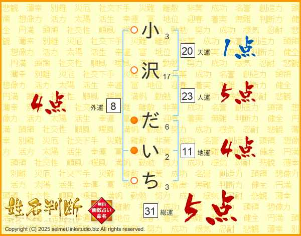 小(3画)沢(17画) だ(6画)い(2画)ち(3画)