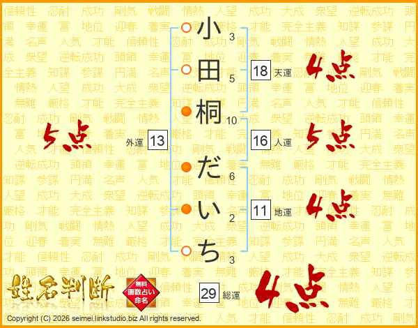 あなたの人生を表す1番重要な運勢です。生涯を通じて影響する総合運となり、主に50歳以降の晩年期に影響を及ぼします。苗字と名前の合計画数。