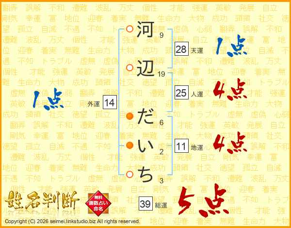 生活面を象徴する運勢です。外部から受ける影響力を表し、結婚運、家庭運や職場、環境への順応性を表します。総運から人運を引いた画数。姓や名が1文字の場合を除く。