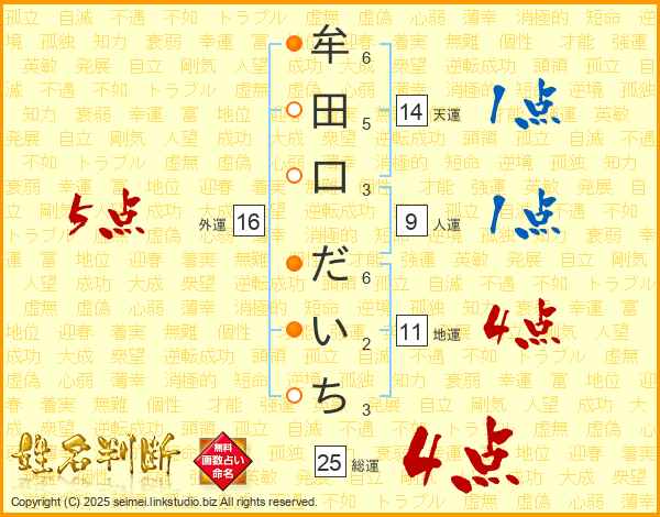 牟(6画)田(5画)口(3画) だ(6画)い(2画)ち(3画)