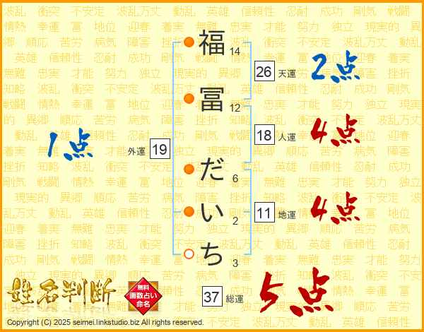 福(14画)冨(12画) だ(6画)い(2画)ち(3画)