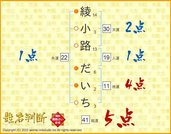 綾(14画)小(3画)路(13画) だ(6画)い(2画)ち(3画)