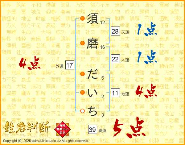 須(12画)磨(16画) だ(6画)い(2画)ち(3画)