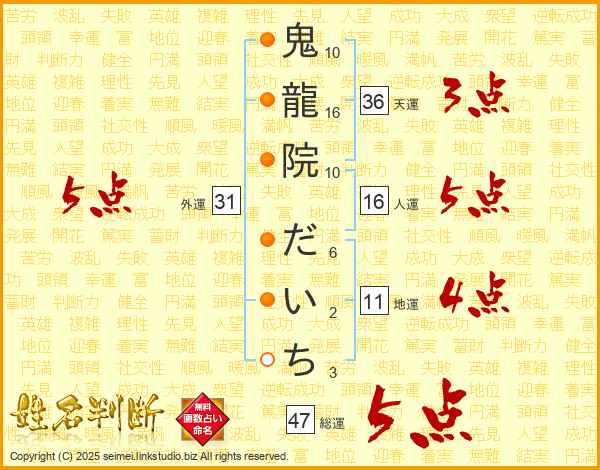 鬼(10画)龍(16画)院(10画) だ(6画)い(2画)ち(3画)