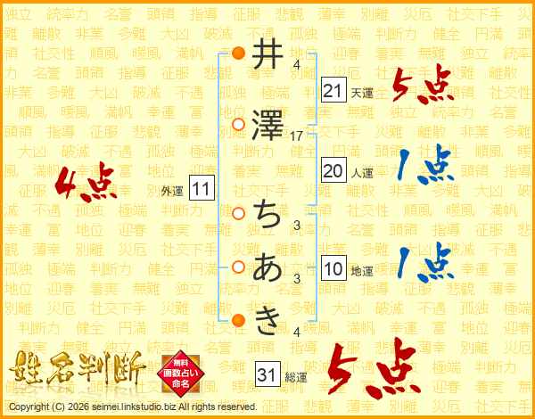 井(4画)澤(17画) ち(3画)あ(3画)き(4画)