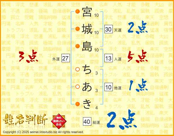生活面を象徴する運勢です。外部から受ける影響力を表し、結婚運、家庭運や職場、環境への順応性を表します。総運から人運を引いた画数。姓や名が1文字の場合を除く。