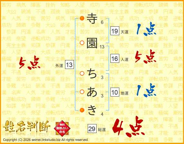 寺(6画)園(13画) ち(3画)あ(3画)き(4画)