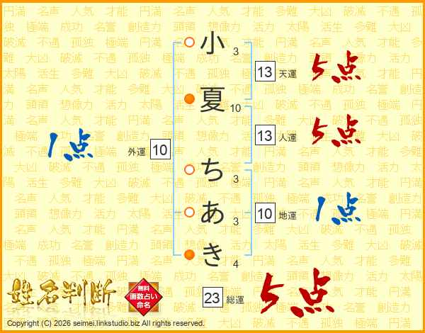 小夏ちあきさんの総運は23画の5点!