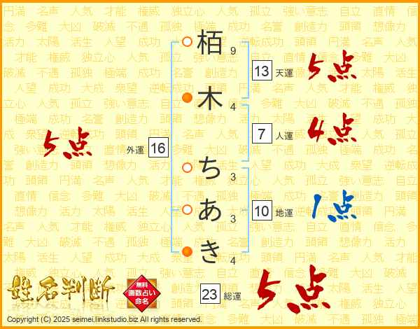 栢(9画)木(4画) ち(3画)あ(3画)き(4画)
