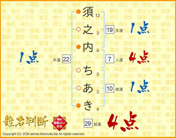 須之内ちあきさんの総運は29画の4点!