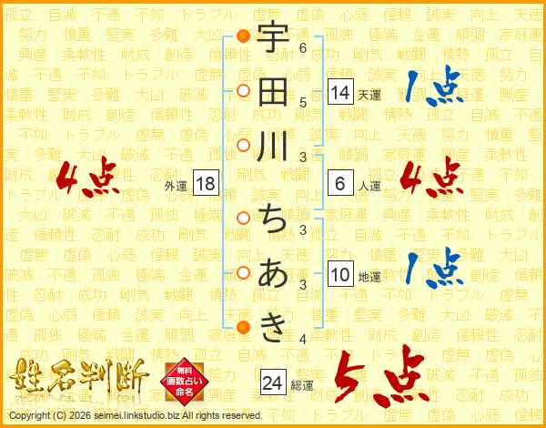 宇(6画)田(5画)川(3画) ち(3画)あ(3画)き(4画)