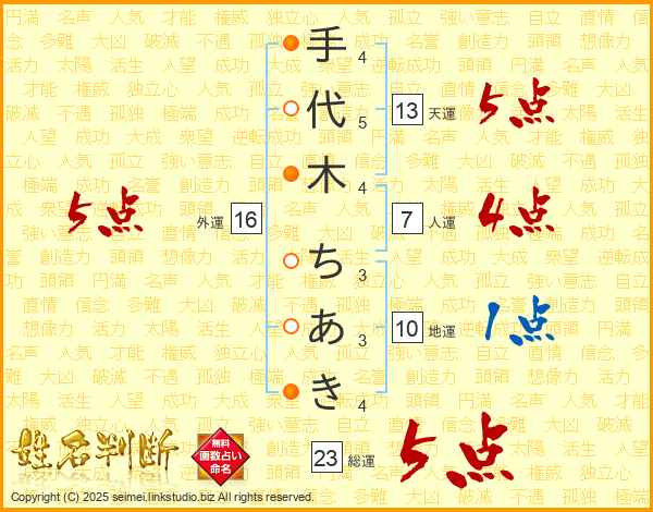 手(4画)代(5画)木(4画) ち(3画)あ(3画)き(4画)