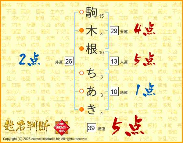 駒木根ちあきさんの総運は39画の5点!