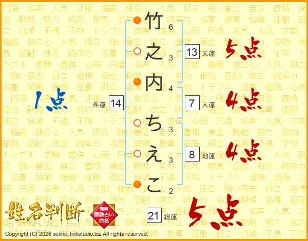 竹(6画)之(3画)内(4画) ち(3画)え(3画)こ(2画)