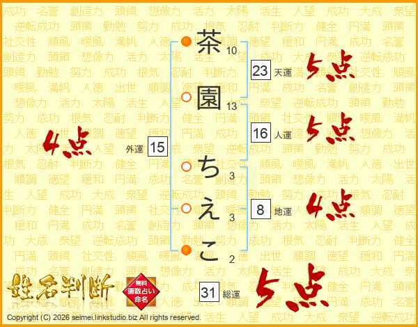 茶(10画)園(13画) ち(3画)え(3画)こ(2画)