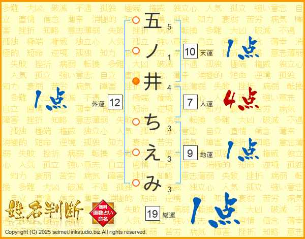 生活面を象徴する運勢です。外部から受ける影響力を表し、結婚運、家庭運や職場、環境への順応性を表します。総運から人運を引いた画数。姓や名が1文字の場合を除く。