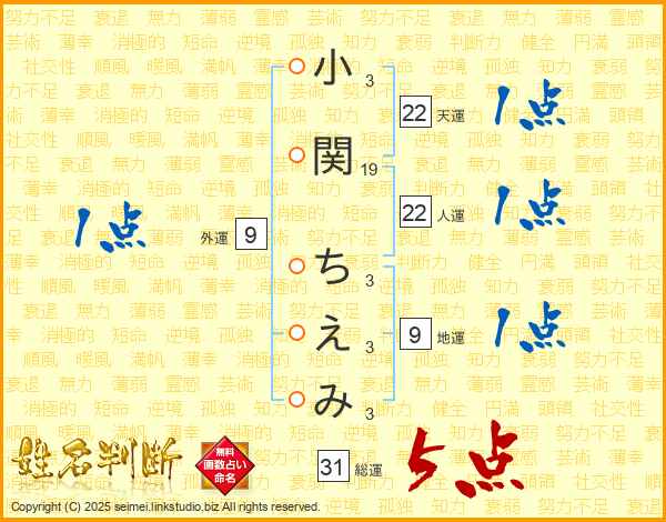 小(3画)関(19画) ち(3画)え(3画)み(3画)