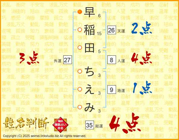 早(6画)稲(15画)田(5画) ち(3画)え(3画)み(3画)