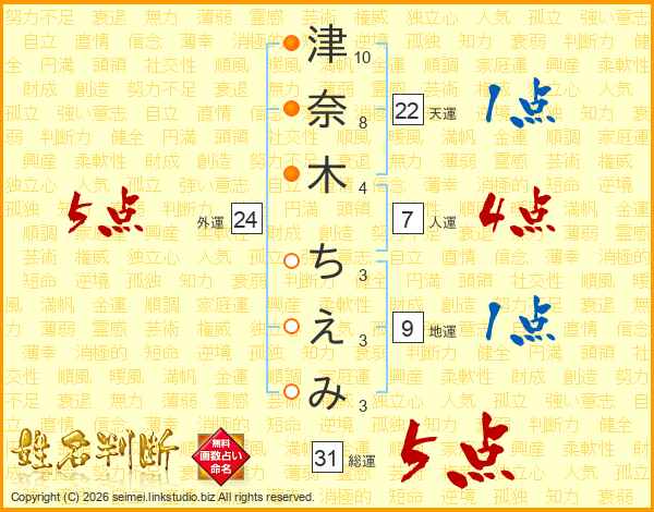 津奈木ちえみさんの総運は31画の5点!