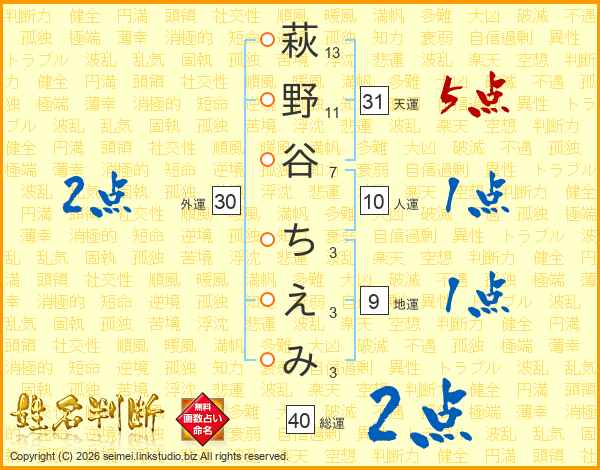 萩野谷ちえみさんの総運は40画の2点!