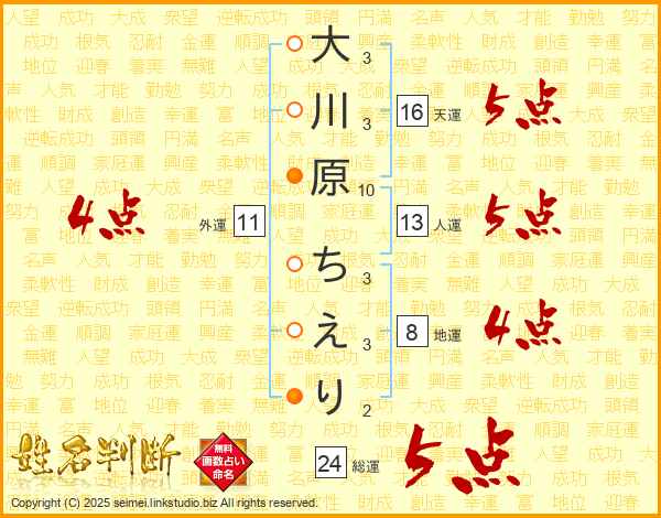 あなたの人生を表す1番重要な運勢です。生涯を通じて影響する総合運となり、主に50歳以降の晩年期に影響を及ぼします。苗字と名前の合計画数。