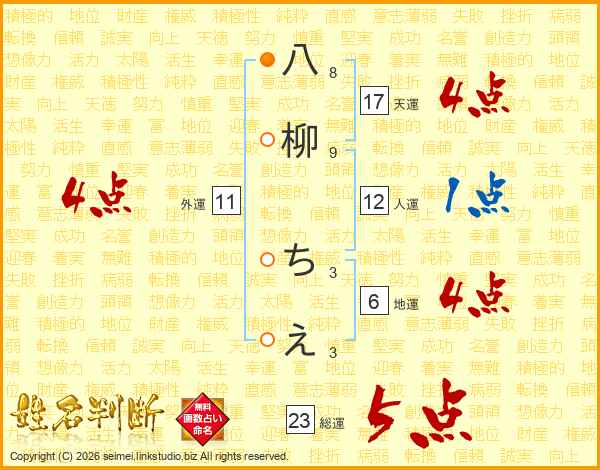 生活面を象徴する運勢です。外部から受ける影響力を表し、結婚運、家庭運や職場、環境への順応性を表します。総運から人運を引いた画数。姓や名が1文字の場合を除く。