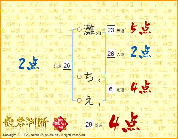あなたの人生を表す1番重要な運勢です。生涯を通じて影響する総合運となり、主に50歳以降の晩年期に影響を及ぼします。苗字と名前の合計画数。