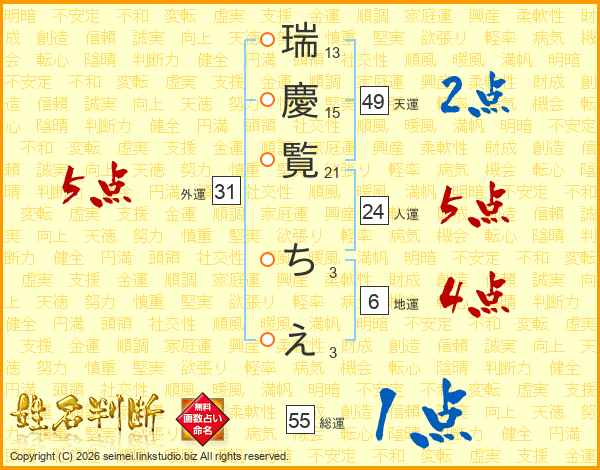 瑞(13画)慶(15画)覧(21画) ち(3画)え(3画)