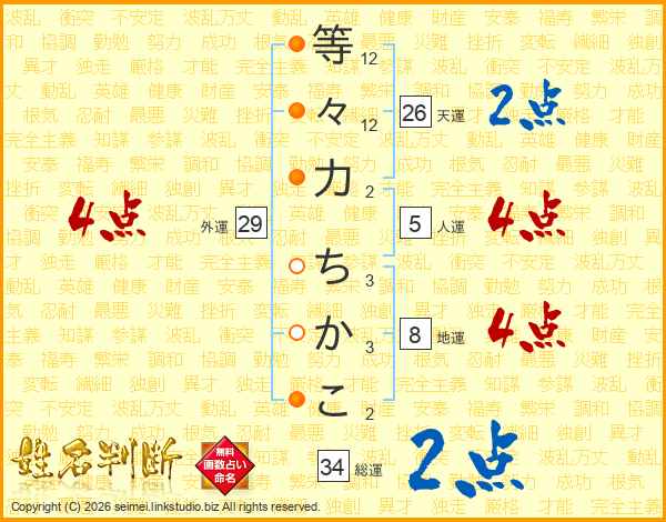 あなたの人生を表す1番重要な運勢です。生涯を通じて影響する総合運となり、主に50歳以降の晩年期に影響を及ぼします。苗字と名前の合計画数。