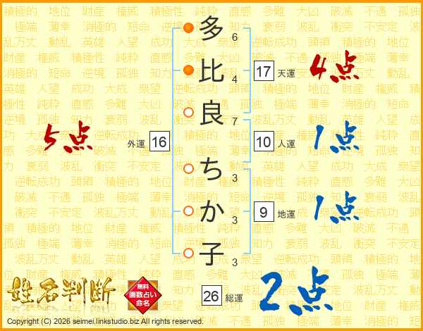 多(6画)比(4画)良(7画) ち(3画)か(3画)子(3画)