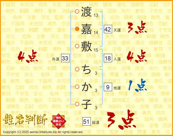 生活面を象徴する運勢です。外部から受ける影響力を表し、結婚運、家庭運や職場、環境への順応性を表します。総運から人運を引いた画数。姓や名が1文字の場合を除く。