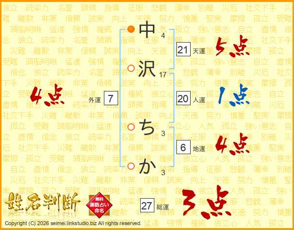 中沢ちかさんの総運は27画の3点!