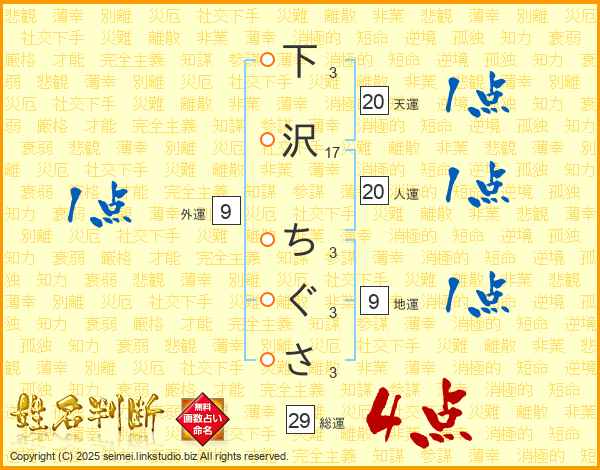 下沢ちぐささんの総運は29画の4点!