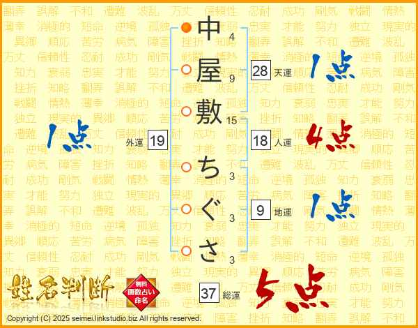中屋敷ちぐささんの総運は37画の5点!