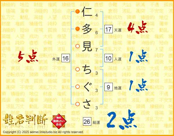 仁(4画)多(6画)見(7画) ち(3画)ぐ(3画)さ(3画)
