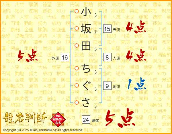 小(3画)坂(7画)田(5画) ち(3画)ぐ(3画)さ(3画)