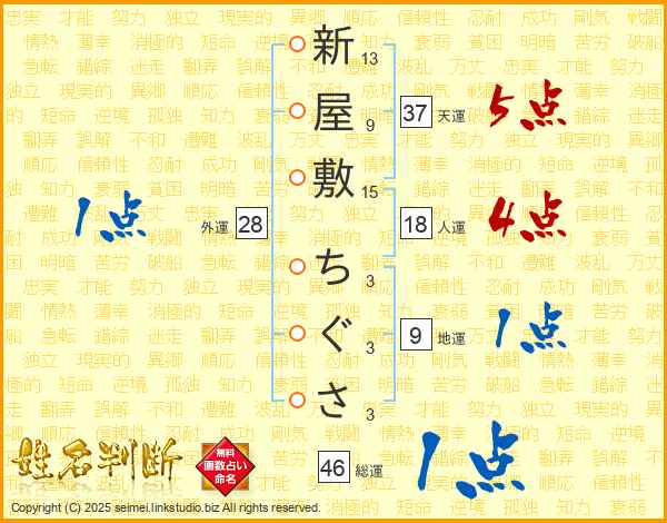 新(13画)屋(9画)敷(15画) ち(3画)ぐ(3画)さ(3画)